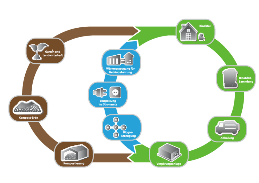 Ähnlich wie beim Komposthaufen im heimischen Garten – nur in viel größeren Dimensionen – wird Ihr Biomüll in einer von zwei Biomassevergärungsanlagen des Landkreis Emsland verarbeitet. Das durch den Verrottungsprozess entstehende Gas wird in Strom und Wärme umgewandelt, während die zurückbleibenden „Gärreste“ des Biomülls weiterverarbeitet werden und sich so weit zersetzen, bis aus ihnen der wertvolle, vielseitig einsetzbare emsländische Kompost entsteht.
