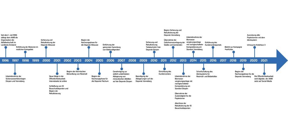 Der Abfallwirtschaftsbetrieb Landkreis Emsland wurde durch Kreistagsbeschluss gegründet und ist seit dem 01. Juli 1996 als kommunaler Eigenbetrieb für die Organisation der Abfallwirtschaft im Kreisgebiet zuständig. Davor war die emsländische Abfallwirtschaft als Abteilung des Amtes für Straßenbau und zuletzt als Amt für Abfallwirtschaft organisiert. Nach verschiedenen Standortwechseln sind die Verwaltung und das Kundencenter heute im Kreishaus III in der Herzog-Arenberg-Straße in Meppen untergebracht. In den letzten Jahrzehnten hat sich viel getan in Sachen Recycling – das Bewusstsein für Umweltund Klimaschutz ist gewachsen und die technischen Möglichkeiten ebenso. Auch die gesetzlichen Vorgaben sind inzwischen strenger, so besteht zum Beispiel ein Deponierungsverbot für unbehandelte Siedlungsabfälle. Bis gegen Ende der 1980er Jahre sah man die Abfallwirtschaft „nur“ als Abfallbeseitigung. Mit den 1990er Jahren begann die getrennte Sammlung und Verwertung: Die Verpackungssammlung wurde eingeführt und im Emsland ein Wertstoffhofsystem mit Grünabfallsammlung aufgebaut.